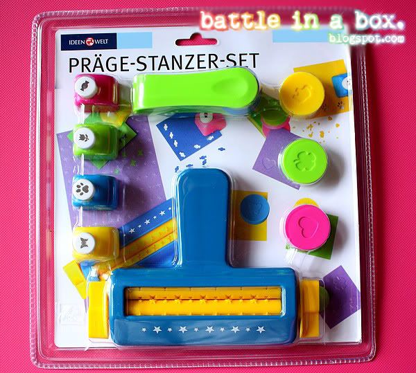 Um weiter auf diesem geistigen Niveau zu bleiben, hab ich mir heute ein Präge- und Stanzset zugelegt. Diese Stanzdinger kosten in Schreibwarengeschäften einzeln immer mindestens drei Euro und eigentlich will ich seit Jahren solchen Schnulli auch endlich besitzen, also hab ich heut im Rossmann zugegriffen. :D