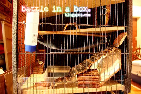 Mittlerweile ist es schon ewig her, dass die Rattenmonster hier in den großen Käfig umgezogen sind, dennoch hab ich es natürlich erst kürzlich geschafft endlich mal Fotos davon zu machen. Hehe.